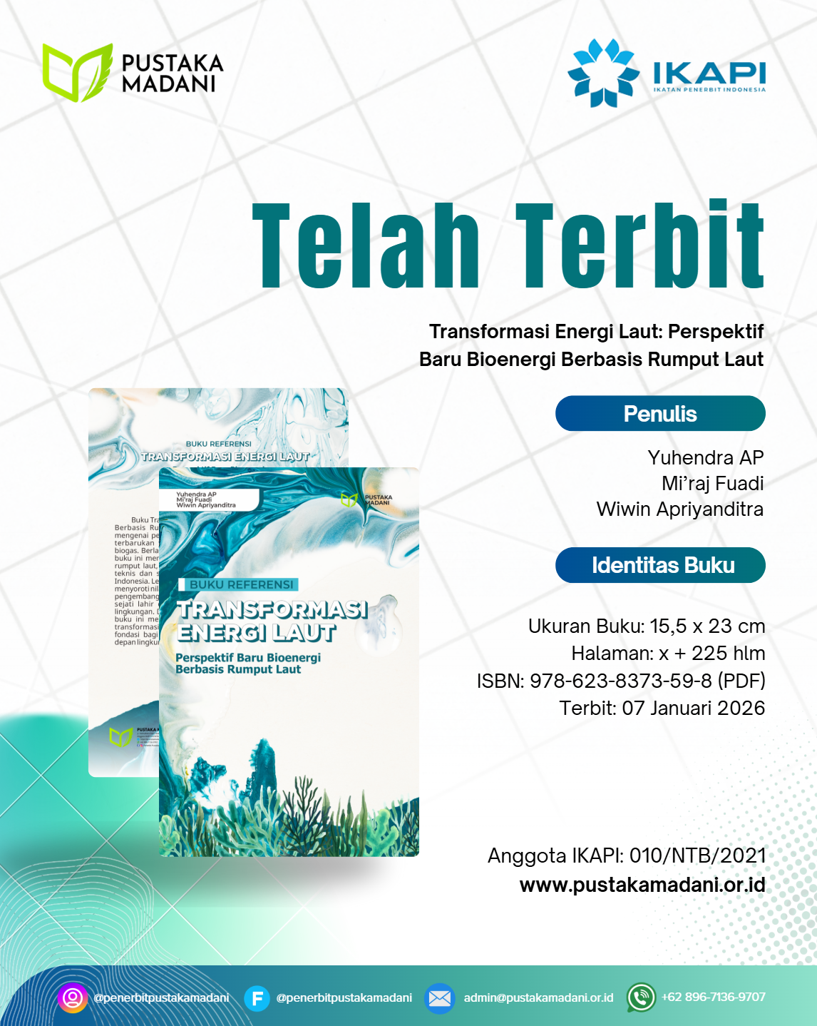 Buku Transformasi Energi Laut: Perspektif Baru Bioenergi Berbasis Rumput Laut menghadirkan kajian mendalam mengenai pemanfaatan rumput laut sebagai sumber energi terbarukan yang berkelanjutan melalui proses produksi biogas. Berlandaskan riset ilmiah dan pengalaman lapangan, buku ini menelusuri keterkaitan antara karakteristik biologis rumput laut, teknologi fermentasi anaerob, serta tantangan teknis dan sosial dalam penerapannya di wilayah pesisir Indonesia. Lebih dari sekadar paparan teknologi, karya ini juga menyoroti nilai-nilai ekologis dan kemanusiaan yang menyertai pengembangan energi laut, menegaskan bahwa keberlanjutan sejati lahir dari harmoni antara sains, masyarakat, dan lingkungan. Dengan gaya naratif yang ilmiah namun reflektif, buku ini menawarkan perspektif baru tentang bagaimana transformasi energi berbasis rumput laut dapat menjadi fondasi bagi ekonomi biru, kemandirian energi, dan masa depan lingkungan yang lebih seimbang.