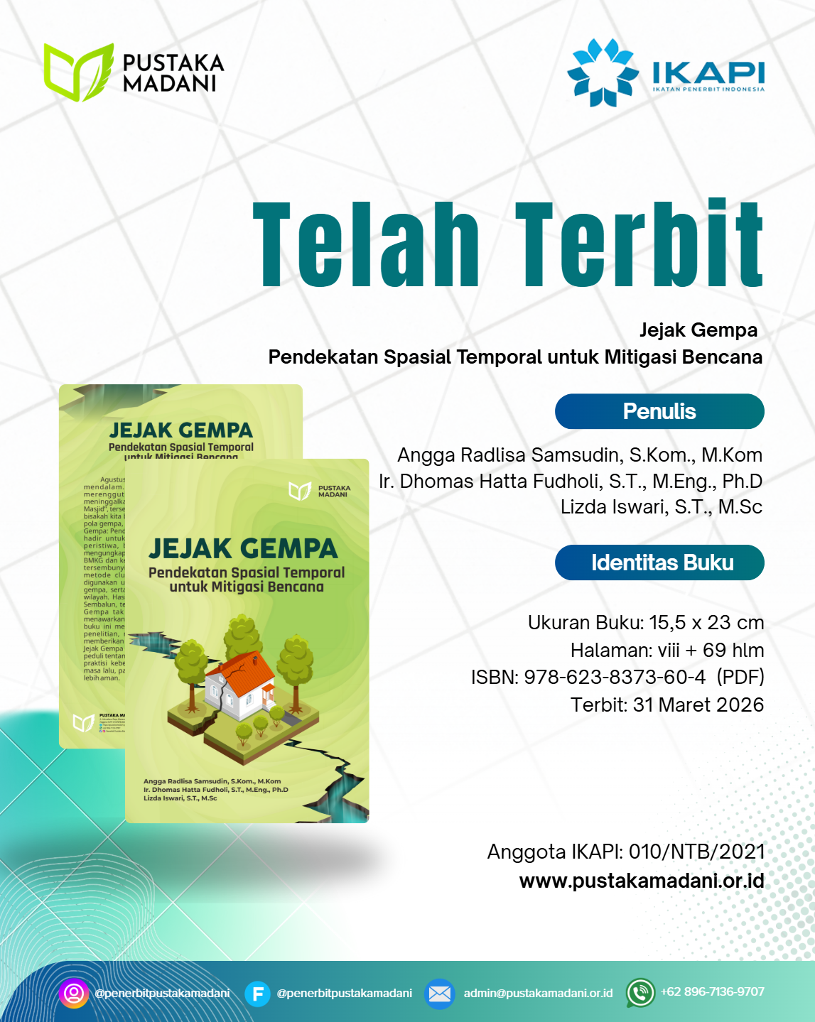 Agustus 2018, Nusa Tenggara Barat (NTB) dilanda duka mendalam. Gempa dahsyat mengguncang Lombok, merenggut nyawa, menghancurkan bangunan, dan meninggalkan trauma. Di balik keindahan “Pulau Seribu Masjid”, tersembunyi kekuatan alam yang tak terduga. Namun, bisakah kita belajar dari bencana ini? Bisakah kita memahami pola gempa, dan mengidentifikasi wilayah rentan? Buku Jejak Gempa: Pendekatan Spasial Temporal untuk Mitigasi Bencana hadir untuk menjawabnya. Lebih dari sekadar catatan peristiwa, buku ini adalah penyelidikan ilmiah yang mengungkap rahasia gempa bumi di NTB. Memadukan data BMKG dan kekuatan data science, buku ini menyingkap pola tersembunyi melalui pendekatan spasial temporal. Dua metode clustering canggih ST-DBSCAN dan K-Means digunakan untuk mengidentifikasi lokasi dan waktu rawan gempa, serta mengungkap karakteristik gempa di berbagai wilayah. Hasilnya? Dua kecamatan di Lombok, Gangga dan Sembalun, terungkap sebagai titik panas gempa bumi. Jejak Gempa tak hanya menemukan masalah, tetapi juga menawarkan solusi. Dengan bahasa yang mudah dipahami, buku ini menjelaskan konsep kunci, memaparkan langkah penelitian, menyajikan hasil analisis secara visual, dan memberikan rekomendasi konkret untuk mitigasi bencana. Jejak Gempa adalah panggilan bertindak bagi siapa saja yang peduli tentang gempa, masyarakat NTB, pengambil kebijakan, praktisi kebencanaan, hingga akademisi. Mari belajar dari masa lalu, pahami risiko, dan bangun masa depan NTB yang lebih aman.