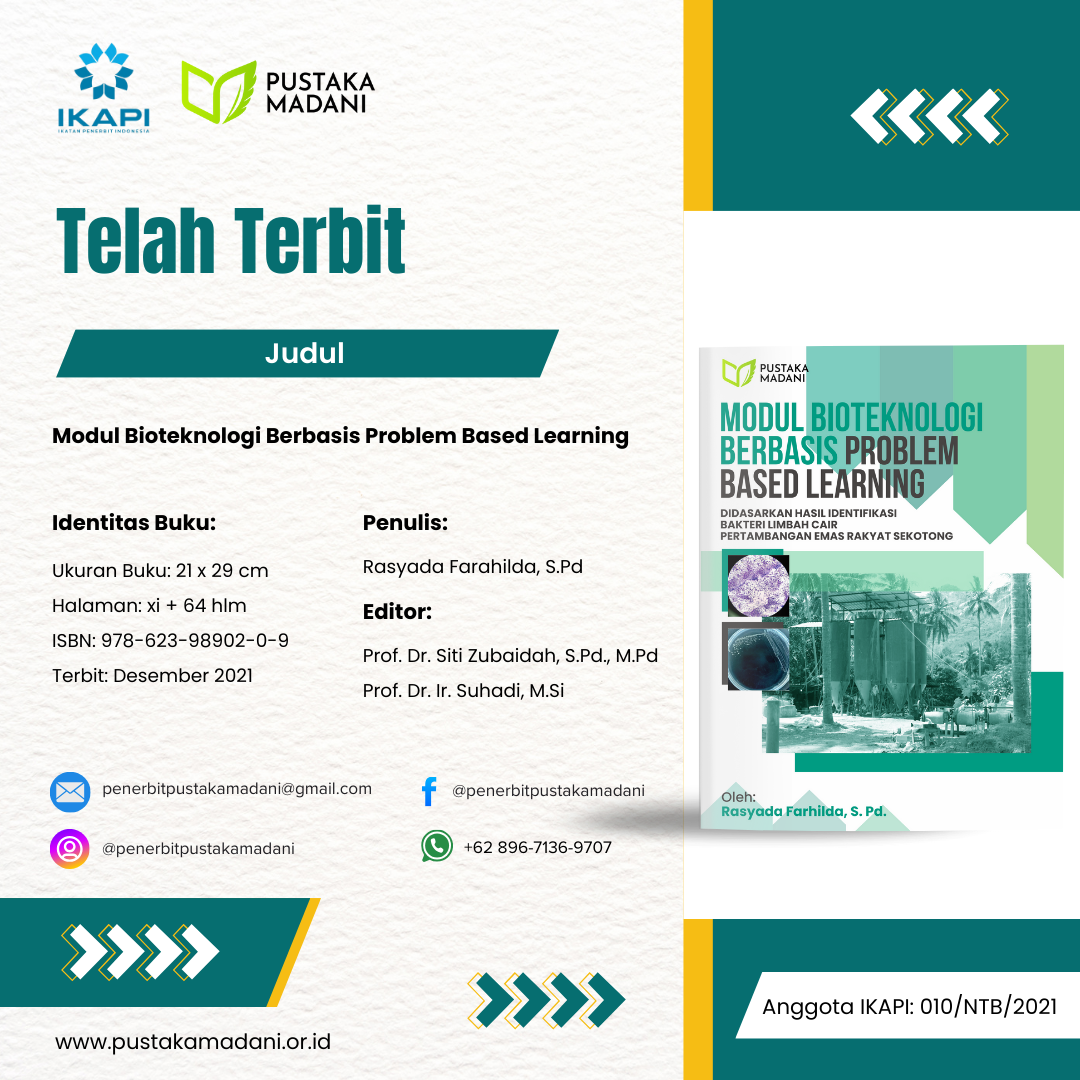 Buku ini merupakan modul pembelajaran biologi pada materi bioteknologi berbasis PBL. Berdasarkan hasil penelitian identifikasi bakteri limbah cair Pertambnagan Emas Rakyat di Sekotong. Modul ini untuk meningkatkan keterampilan berpikir kritis dan keterampilan komunikasi. Dengan adanya modul ini diharapkan dapat menjadi salah satu tambahan informasi bahan ajar yang dapat diterapkan di dunia pendidikan.