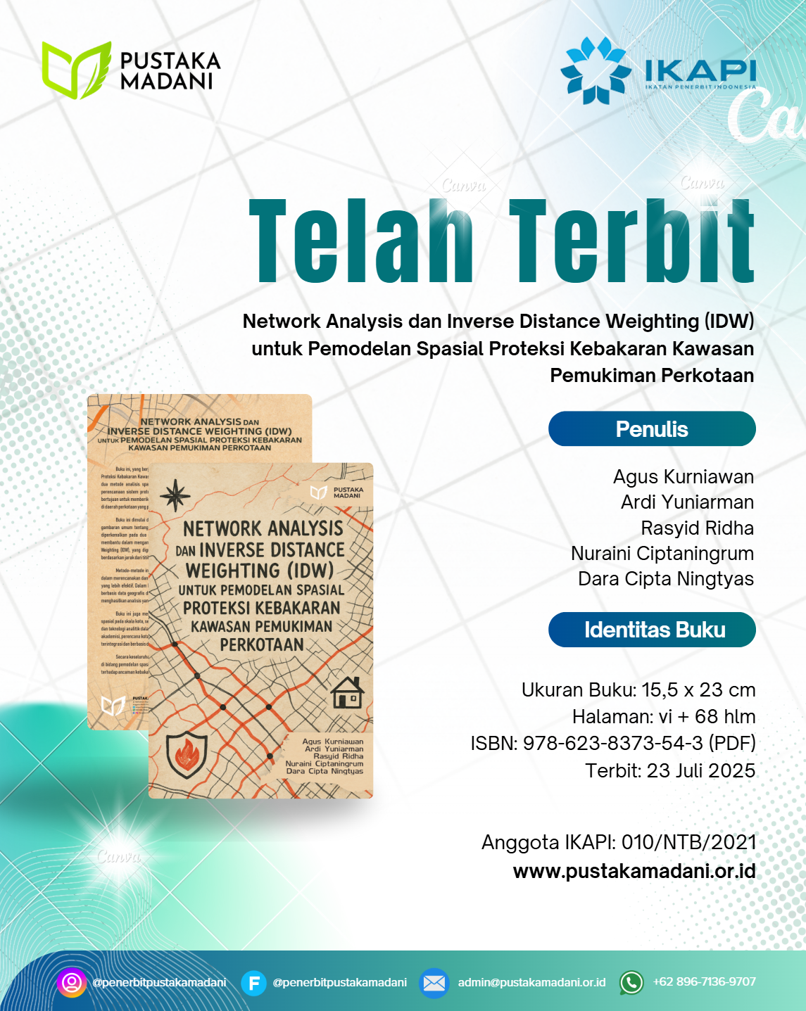 Metode-metode ini diterapkan untuk merancang model spasial yang dapat membantu pihak berwenang dalam merencanakan dan mengoptimalkan jaringan pemadam kebakaran serta merumuskan kebijakan mitigasi yang lebih efektif. Dalam buku ini, pembaca akan mendapatkan pemahaman mengenai teknik pemodelan yang berbasis data geografis dan teknologi informasi, serta bagaimana kedua metode ini saling berinteraksi dalam menghasilkan analisis yang komprehensif untuk perencanaan proteksi kebakaran di kawasan pemukiman.