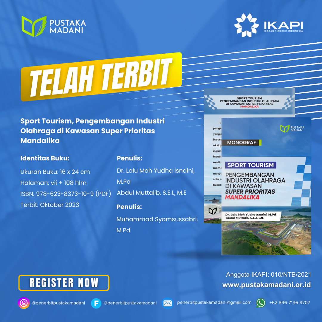 Tujuan penulisan buku ini untuk dapat mengenalkan pengembangan industri olahraga di Kuta Mandalika yang disertai dengan pengetahuan pengertian dan jenis industri olahraga, pengembangan industri olahraga, aksi pengembangan industri olahraga, model-model industri olahraga, analisis industri olahraga, pemasaran industri olahraga, dampak industri olahraga dan peran media massa dalam olahraga. Semoga buku ini dapat membantu kalangan akademisi mahasiswa dan masyarakat pengelola industri olahraga sebagai salah satu referensi atau sumber mata kuliah. Serta semoga buku ini bisa bermanfaat bagi pembacanya.