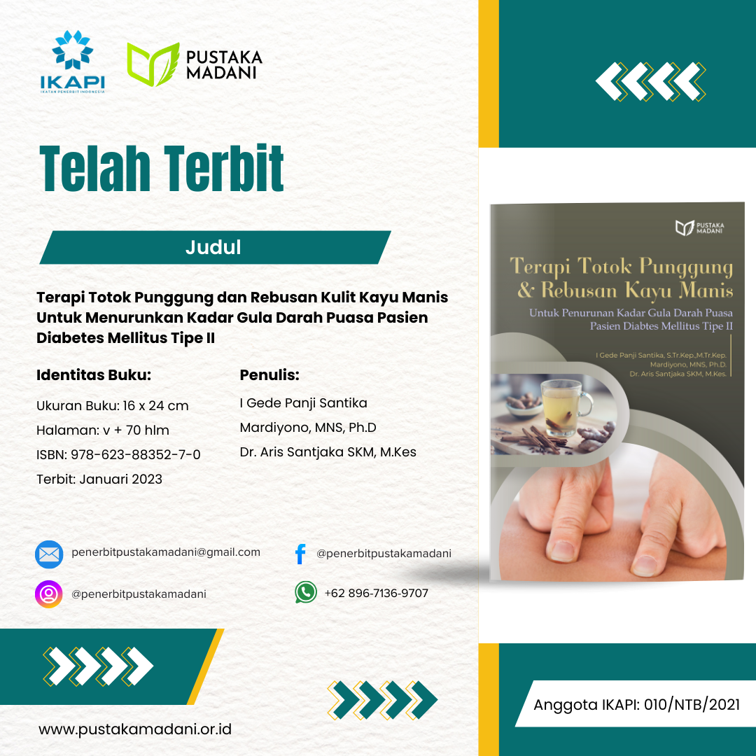 Buku ini menjelaskan terkait dengan Terapi Totok Punggung dan Rebusan Kulit Kayu Manis Untuk Menurunkan Kadar Gula Darah Puasa Pasien Diabetes Mellitus Tipe II. Diabetes mellitus merupakan penyakit degeneratif yang terjadi akibat gangguan metabolik menahun karena pancreas tidak cukup untuk memproduksi insulin atau tubuh tidak bisa menggunakan insulin yang diproduksi secara optimal dan efektif.1 Diabetes mellitus dapat mengakibatkan beberapa komplikasi mulai dari kepala hingga kaki, dari penyakit jantung dan stroke, gagal ginjal hingga infeksi yang mengakibatkan amputasi pada ekstremitas, hingga menimbulkan kematian pada penderita.2 Penyebab Diabetes Mellitus (DM) tipe II yaitu keturunan (50%), Usia, Jenis kelamin lebih banyak terjadi (80,4%) dibandingkan dengan laki-laki (25%), obesitas, kurang aktivitas fisik, pola makan tidak sehat, stres, obat-obatan.